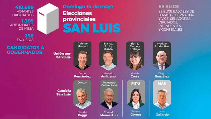 La provincia de San Luis celebra las elecciones provinciales en las cuales 418.689 ciudadanos están habilitados para elegir 162 cargos, entre los que se encuentran los de gobernador y vicegobernador; 17 intendencias con sus respectivos concejos deliberantes; 21 diputados y cinco senadores provinciales, en comicios que se realizarán mediante el sistema de Ley de Lemas, reinstaurado el año pasado.