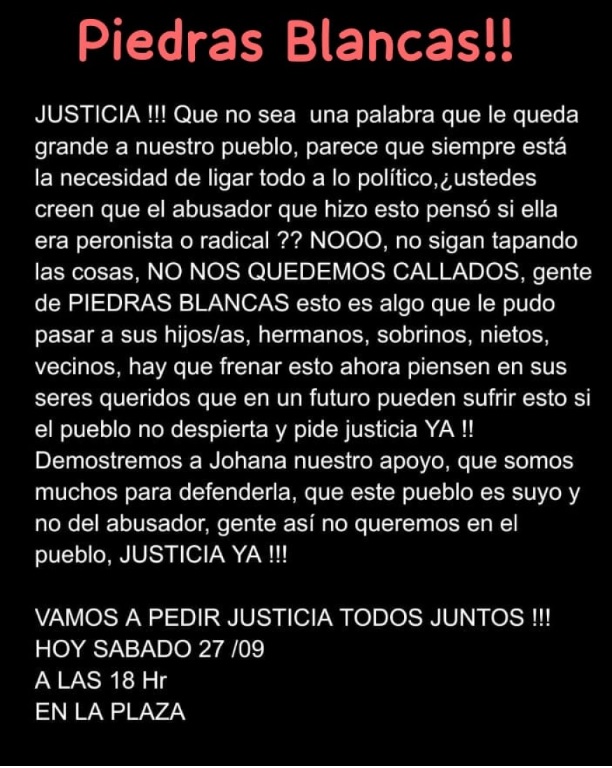 Tras conocerse el hecho, vecinos de la localidad convocaron a una movilización para este sábado a las 18:00, que recorrerá las calles de Piedras Blancas en reclamo de justicia y mayor seguridad.
